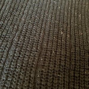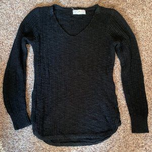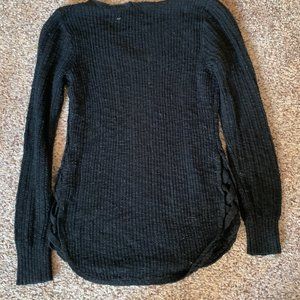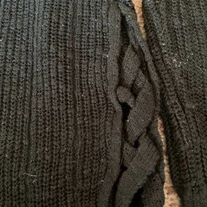 Super cute black v-neck sweater, knit in style with braids on the side. Sweater has some minor pilling, shown, but is in otherwise good condition. Size small.