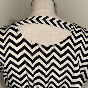 This Pink Republic mini dress features a chic chevron print design in black and ivory. The dress is made of polyester and has a pullover closure. It has a sleeveless design and comes in size small, suitable for women. The dress is pre-owned but still in excellent condition.