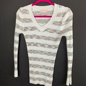 Pink Republic Womens Sweater Size Large Brown White Stripe. Long Sleeve V Neck.