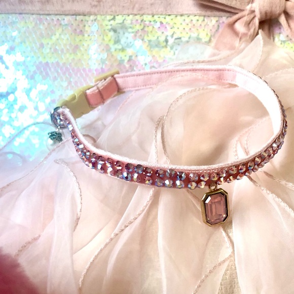 Elegant pink 14in cat collar adorned with sparkling rhinestones and a charming pendant. Made with crystals from the Czech Republic. Preciosa crystals from Bluestreak Crystals were used.