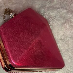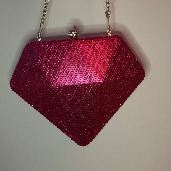 This stunning diamond shaped pink rhinestone clutch is perfect for any special occasion. Its elegant design and sparkling finish make it a standout accessory.