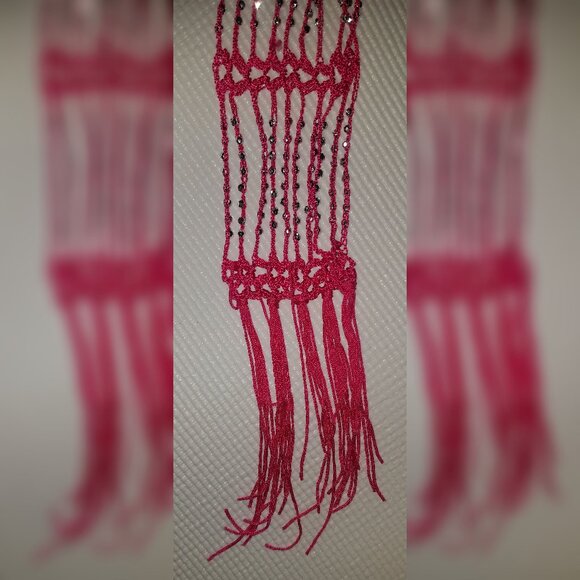 I am not certain what this would be called but you wear it around your neck. It is long enough that you can either tie it, wrap it or leave it hang. It is stretchy width direction but not stretched it is 3 inches wide with 6 inch fringe on either side and covered in rhinestones. The total length without the fringe is 65 inches long, with the fringe it is 71 inches long approximately. Never worn but no tags