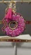 Sparkling pink rhinestone donut keychain with gold accents and a pink tassel.