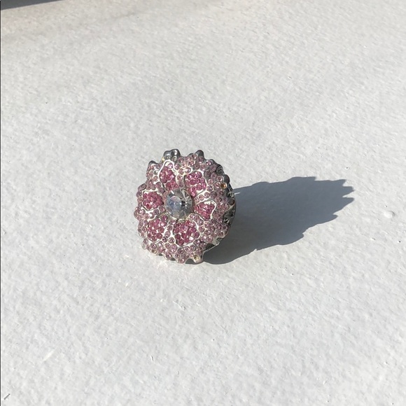 Costume jewelry large rhinestone flower ring. Notes of light and dark pink with a large clear rhinestone in the center.