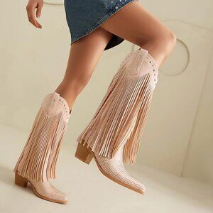 Pink Rhinestone Fringe Cowgirl Boots Women Pointed Toe Western Mid Calf Shoes