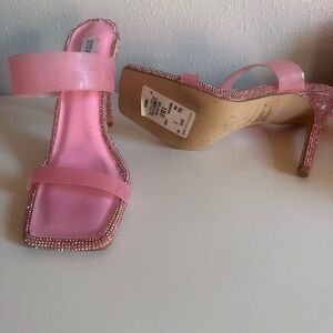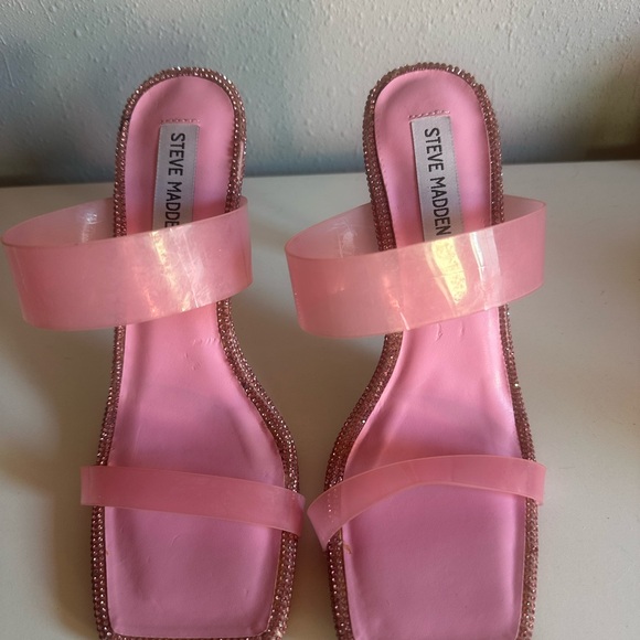Pink Rhine stone Steve Madden heels there is wear from people trying them on in the store but they have not actually been worn out . Some stones are missing from being in the closet