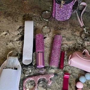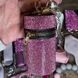 Assorted pink rhinestone and blush accessories. Includes pom pom, heart rhinestone charm, lip balm holder, keychains, and beaded bracelet. Sparkly and playful pieces. Great for bag or keys.