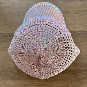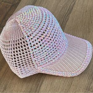 Stylish pink mesh cap adorned with sparkling rhinestones. Perfect for adding a touch of glam to any outfit. In like new condition. Adjustable in the back. Adult Size