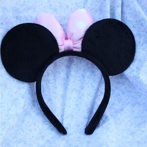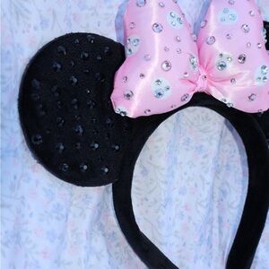 Adorable Minnie Mouse ears headband with a pink bow. Features sparkling embellishments.