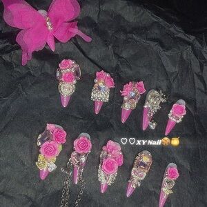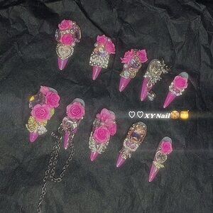 XS Size. One of a kind nail art set(11 nails) featuring rhinestones and pink roses. One extra nail design for alternate. Perfect for a standout look. Will include jelly glue that the press on nails were able to be reusable.