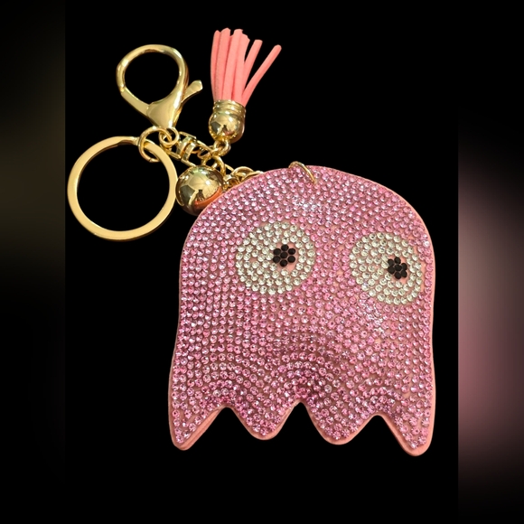 Sparkling pink rhinestone pac man ghost keychain with gold accents. Features large eyes and a playful design.