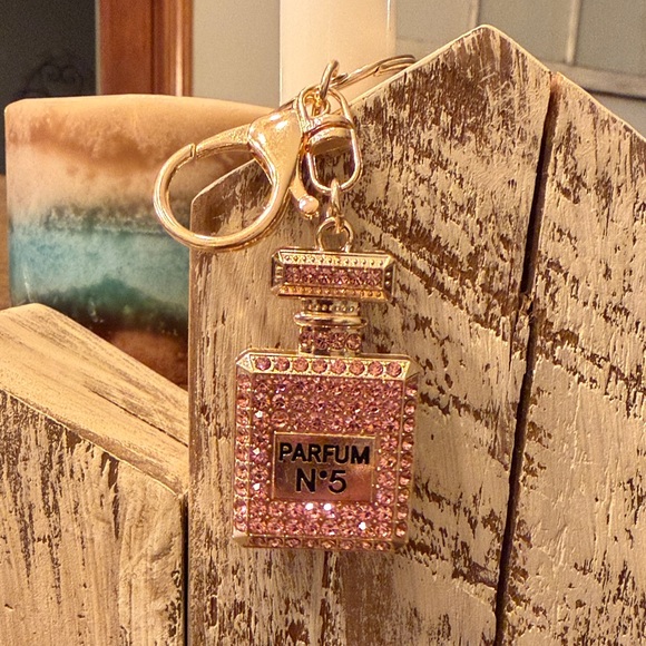 Elegant keychain with pink rhinestones. Features a perfume bottle design.