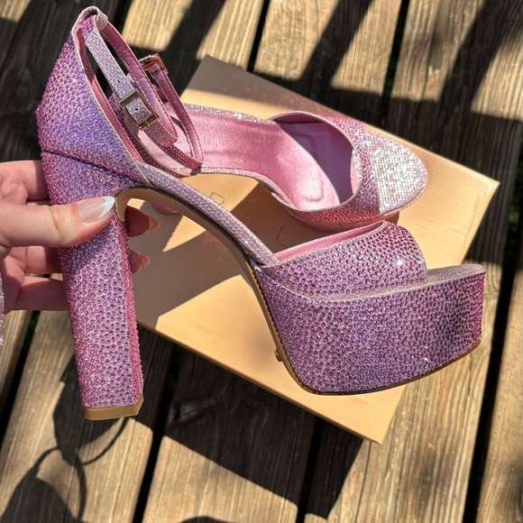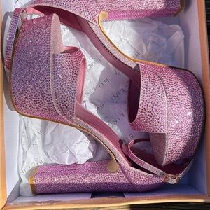size 9 pink glamorous platform sandal heels with adjustable ankle straps with buckle.