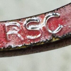 This is a perfect pinky ring! It is marked inside with RSC which is a makers mark. It is silver tone.