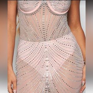 Pink / Mauve Purple in color - Rhinestone embellished sheer dress - Comes with undergarment - Dress is form fitting, fabric does stretch - Great condition, only worn once