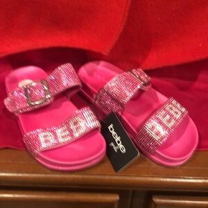 Sparkling pink slide sandals with rhinestone embellishments. Perfect for adding a touch of glam to any outfit.