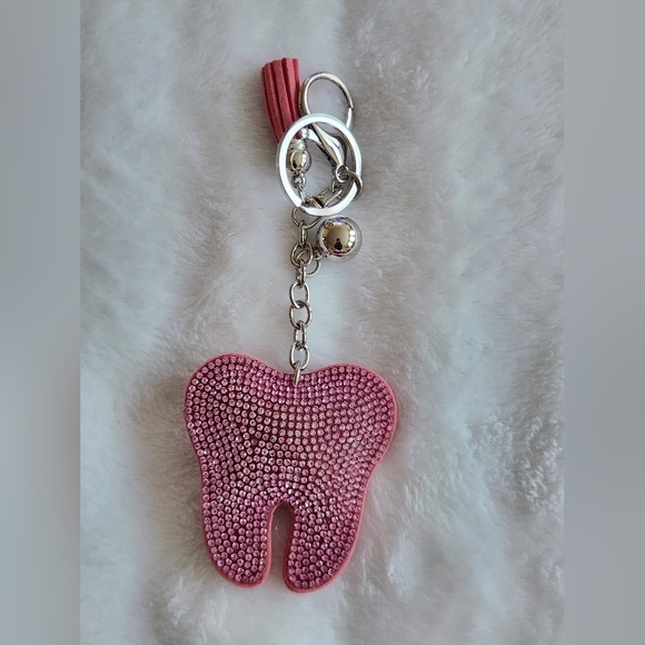 Add a touch of sparkle to your accessories with this pink rhinestone tooth keychain. Perfect for a Dentist, RDH, DA, or students!