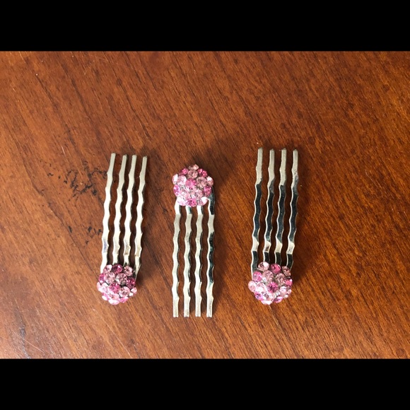 3 Hair combs with pink and rose colored rhinestones. The jewel is about 2/3” in diameter. The prongs are a little over 1 “ long
