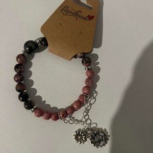 This stretchy bracelet is Handmade with Love by yours truly. Featuring natural stone with a larger hematite accent bead and flower charms. 6-1/2" Diameter.