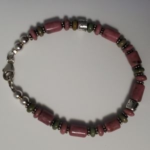 Pink Tumbled Rhodonite.. natural mineral with light green stones and silver beads. It was stated as 925 silver at time of purchase, however I did not confirm.