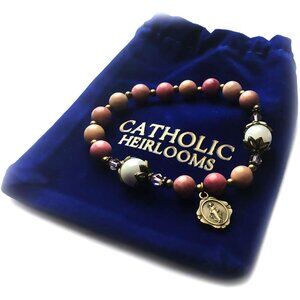 Features: Elegant stretchable rosary bracelet with 8 mm genuine pink Rhodonite beads and 10 mm Mother of Pearl Our Father beads. Ornate Miraculous Medal charm adds a special touch. Includes a how-to-pray pamphlet and prayer card, making it perfect for personal devotion or gift-giving. Designed exclusively in California by a Catholic family-owned small business.