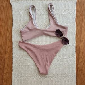 Pink ribbed bikini set. Material is ribbed and surprisingly comfortable and stretchy. Top has a knot detail, but it cannot be untied or adjusted. Super cute.
