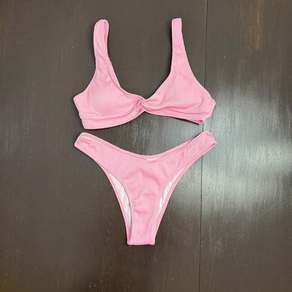 Baby pink ribbed bikini set with cheeky bottoms and adjustable straps.