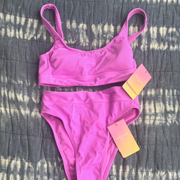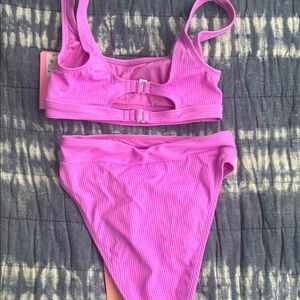 Stylish pink ribbed bikini set. Features a scoop neck top and high-waisted bottoms.