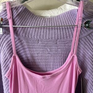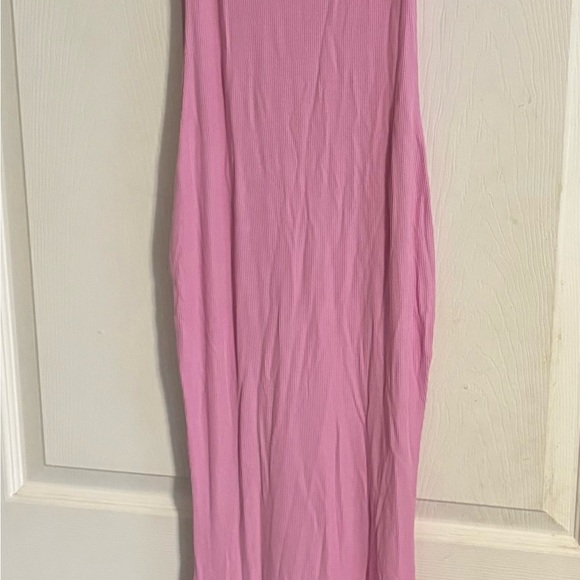 Soft ribbed knit. Sleek bodycon silhouette. Sleeveless with straight neckline. Vibrant pink color. The pink dress shown is a Lounge Long Slip Dress. This maxi-length bodycon dress features a ribbed texture, a scoop neckline, and adjustable spaghetti straps.