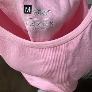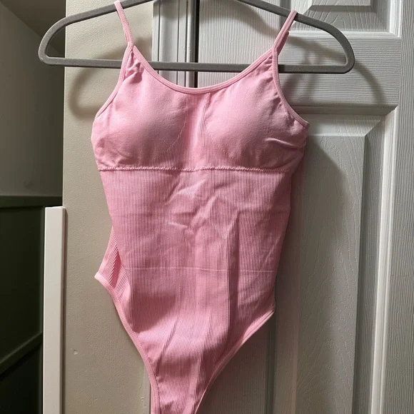 Stylish pink ribbed bodysuit with spaghetti straps. Perfect for layering or wearing alone.