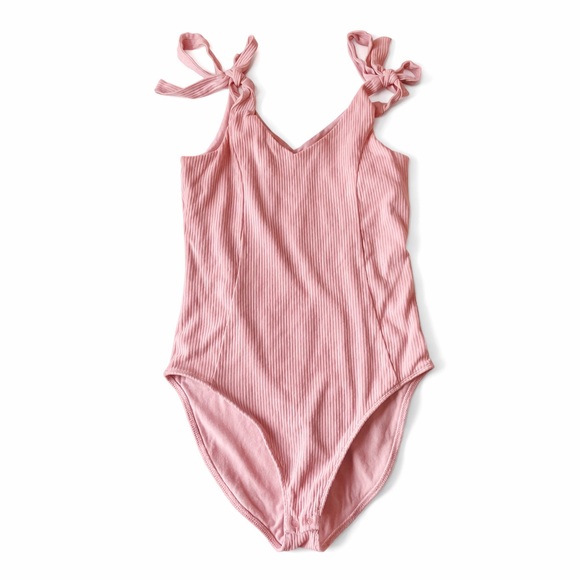 Chic blush ribbed bodysuit with elegant tie straps.