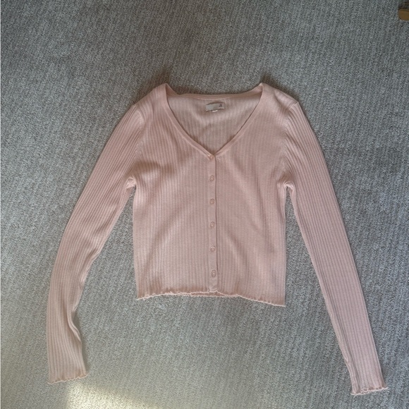 Stylish pink ribbed shirt with button-up front. Perfect for layering! The ruffled hem and baby pink color makes this the perfect coquette top