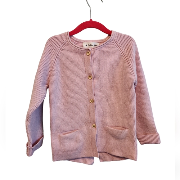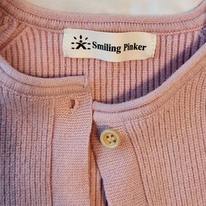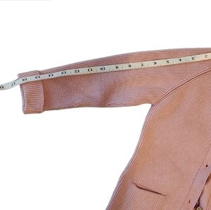 This pink cardigan is thick and very soft. Perfect for Fall/Spring weather. It has a ribbed weave, a classic button down front, a turned up folded sleeve, and a small slit in the back. Features two small pockets in front as well.