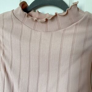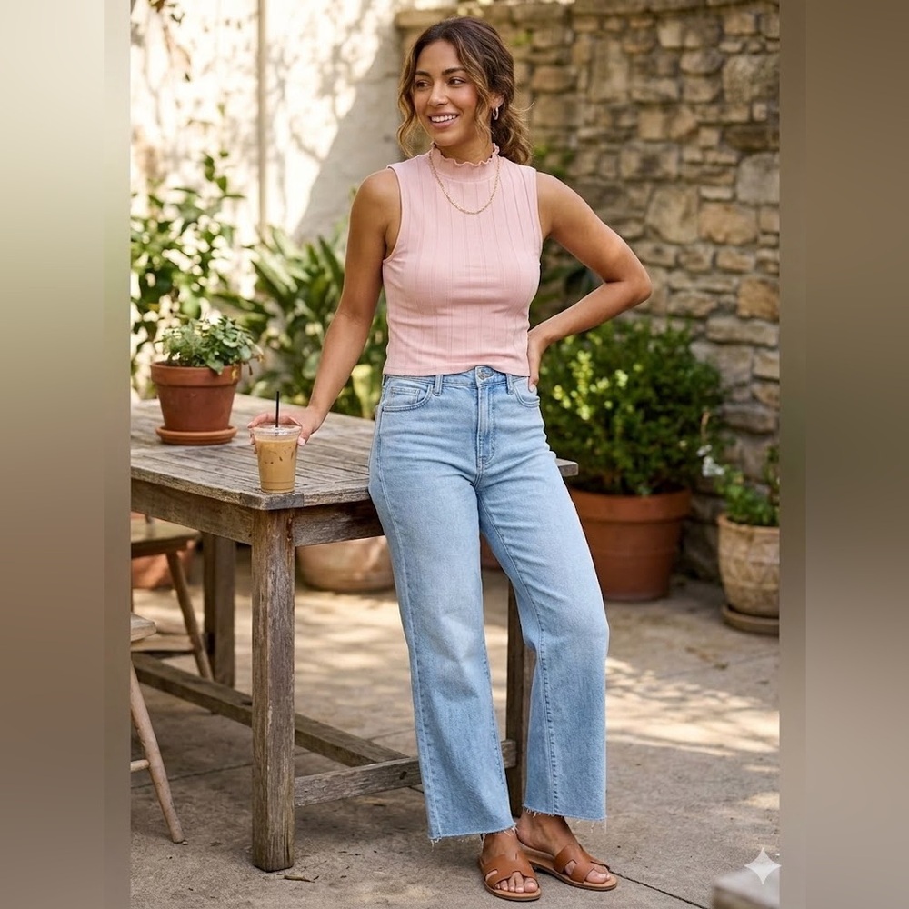 This stylish pink tank top features a ribbed texture and a cropped hemline, perfect for a chic and modern look. The sleeveless design and ruffled details add a touch of elegance, making it a versatile piece for any wardrobe.