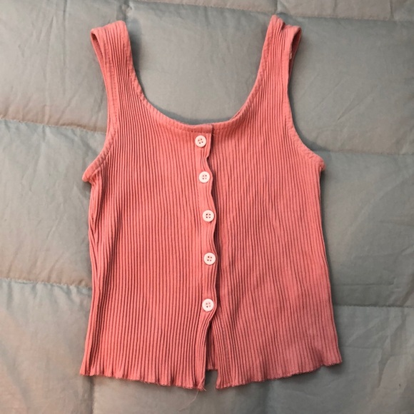 Pink button down slight crop top, ribbed stretchy material, white buttons down front