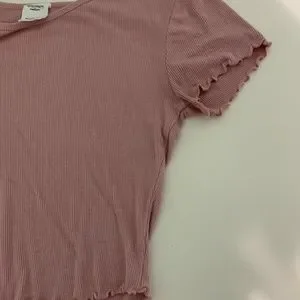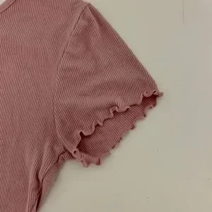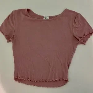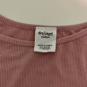 Destined Medium sized light pink fitted crop top. It has short sleeves and ribbing around the sleeves and bottom. There is a U-shaped neck line.