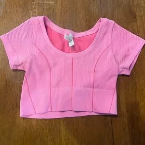 Stylish ribbed crop top. Features a scoop neckline. Perfect for casual wear.