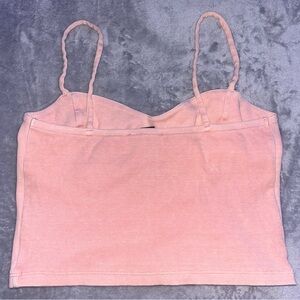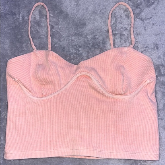 Stylish pink ribbed crop top with spaghetti straps. Perfect for casual outings.