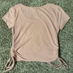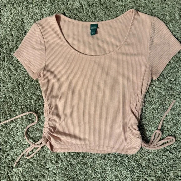 This stylish pink ribbed crop top features a flattering scoop neckline and adjustable side ties for a customizable fit. Perfect for casual outings or pairing with your favorite jeans.