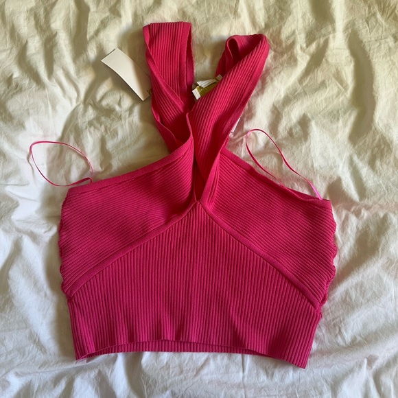 Stylish pink ribbed crop top with a unique cross-strap design. Perfect for casual outings.