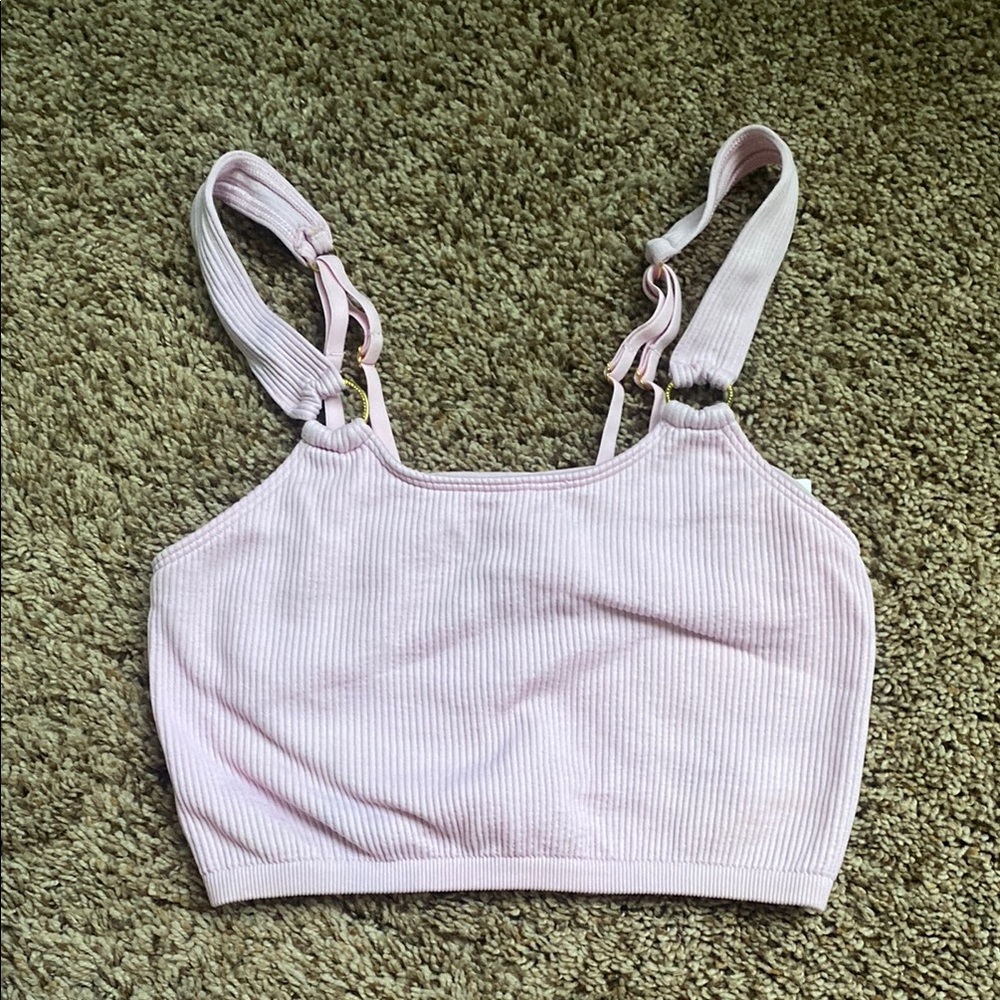 Stylish pink ribbed crop top with adjustable straps. Perfect for casual wear.