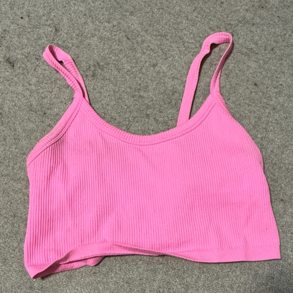 Stylish pink ribbed crop top with spaghetti straps. Perfect for casual wear. Has a built in bra.