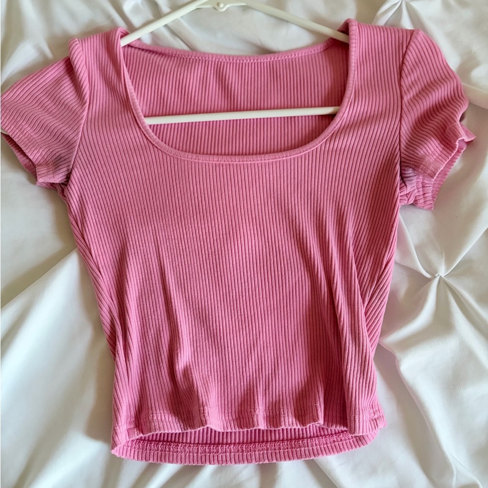 Stylish pink ribbed crop top. Perfect for casual outings.