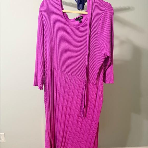 vibrant pink dress with ribbed texture. Long sleeves for a stylish look. Ideal for any occasion. Tie for waist.