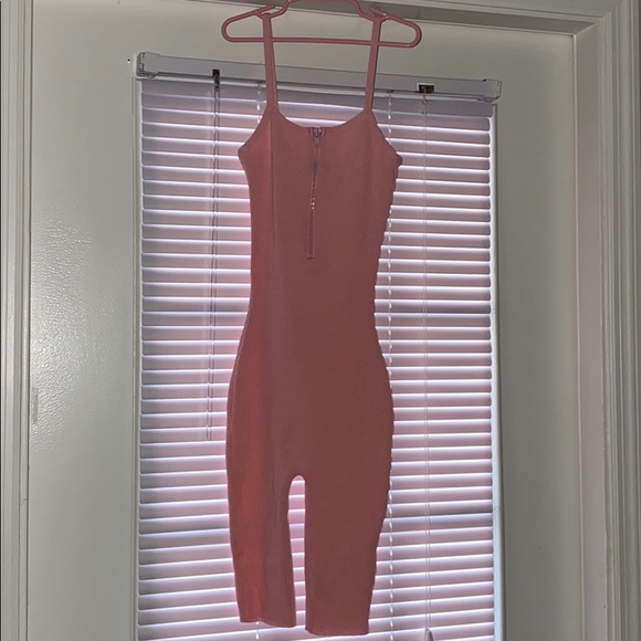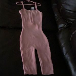 Pink colored ribbed jumpsuit that stops right above the knee. Has very good stretch!