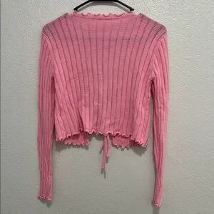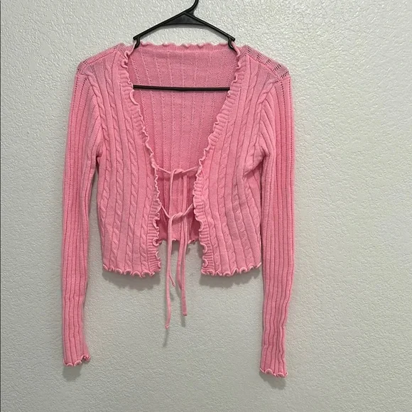 Chic pink ribbed knit cardigan with tie front. Features ruffled edges for a stylish look.