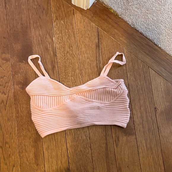 Stylish pink ribbed knit crop top with adjustable straps. Perfect for casual wear.