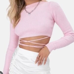 Adika Stylish pink ribbed knit cropped sweater with long sleeves and lace-up detail. vote for valenties size m/L fits more small/medium small piling as seen in first pic can be easily removed