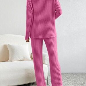 Cozy and stylish, this pink ribbed knit lounge set is perfect for relaxing at home. Enjoy the soft, comfortable fit and chic design.