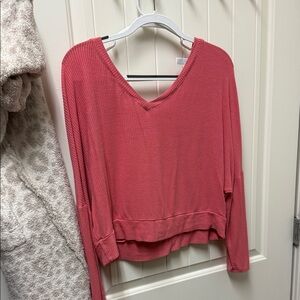 Cozy pink ribbed knit sweater with a relaxed fit. Perfect for casual wear.